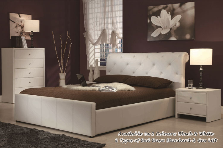 The rolled-top upholstered headboard features generous, deep buttoning. The design is reminiscent of the traditional Chesterfield sofa. Luxurious padding continues on the sides and foot board hence completing an image of timeless elegance. The Chester is available in black or white.